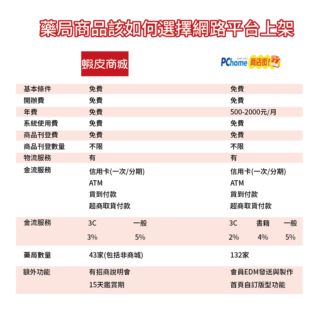 而目前在蝦皮購物平台上搜索到的藥局有43家,yahoo超級商城的店家數為10家,MOMO摩天商城約為5家,東森購物大約30家,Pchome商店街搜尋店家則有132家,以下我們整理出兩家較大的購物平台網站,內容包含上架費用、開店費用以及藥局競爭數量等等,提供給有想要上架到第三方電商平台的賣家參考。